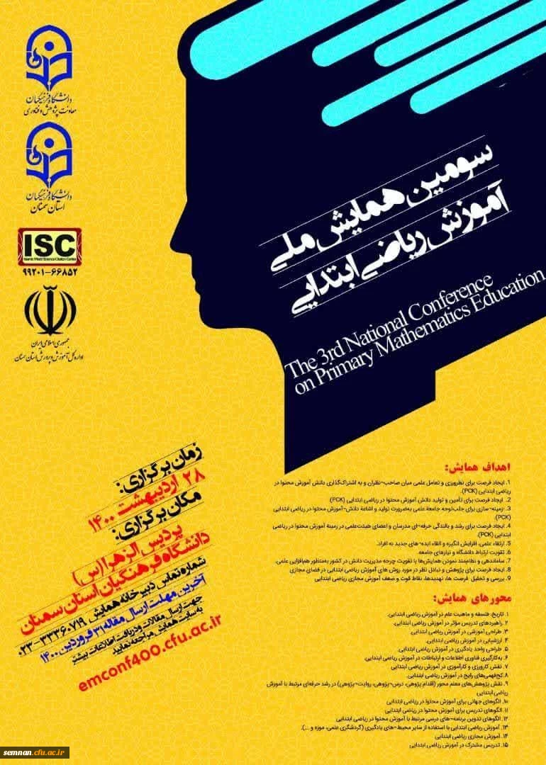 امتیاز دهید : برگزاری سومین همایش ملی آموزش ریاضی ابتدایی به میزبانی پردیس الزهرا (س) سمنان 6 سهشنبه 28 اردیبهشت 1400 ساعت 14:05