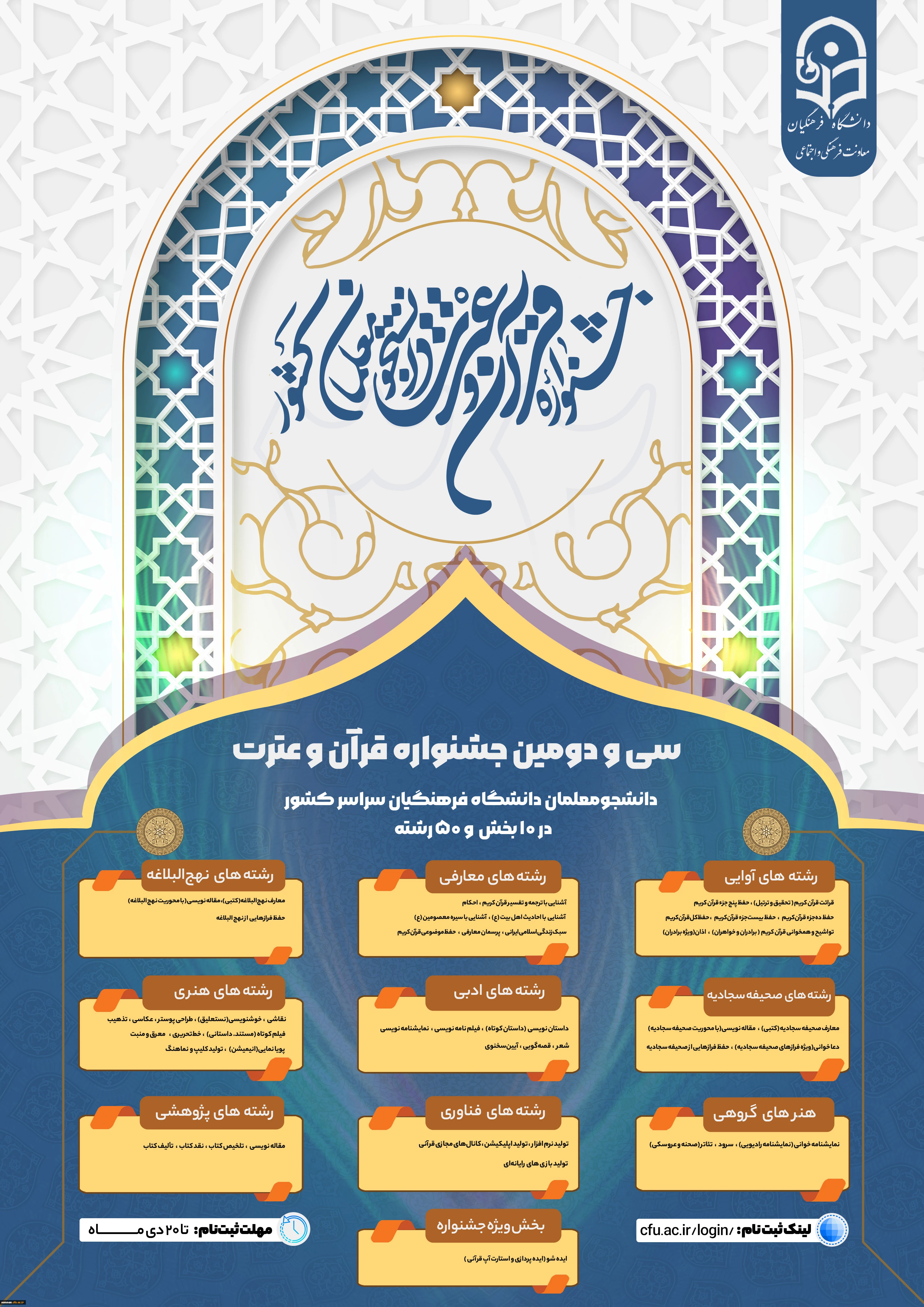 امتیاز دهید : تمدید مهلت ثبت نام سی و دومین جشنواره قرآن و عترت دانشگاه فرهنگیان 2 دوشنبه 27 دی 1400 ساعت 13:30