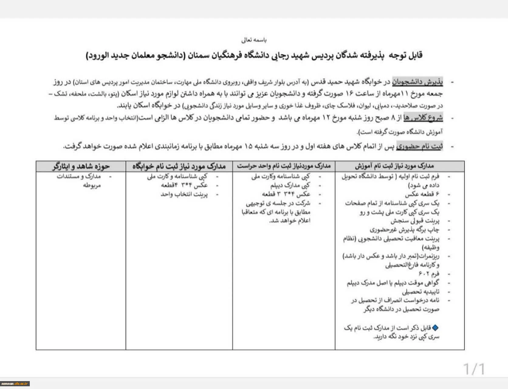 اطلاعیه پذیرش، ثبت نام و آغاز کلاس های دانشجو معلمان جدید الورود پردیس شهید رجایی دانشگاه فرهنگیان سمنان 2
